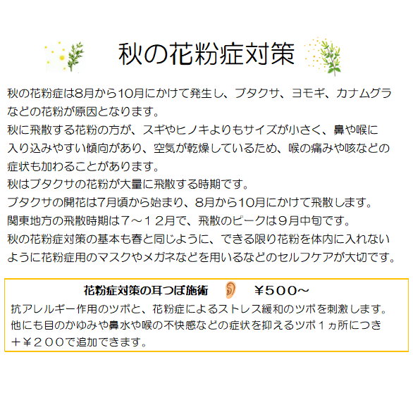 花粉の粒子の大きさも春の花粉よりも小さく、特にブタクサ花粉はスギ花粉の半分の大きさなので、気管支や肺まで入り込みやすくなります。そのため、くしゃみ・鼻みず・鼻づまりなどの鼻炎症状や目のかゆみに加えて、咳が出やすいことが特徴です。
